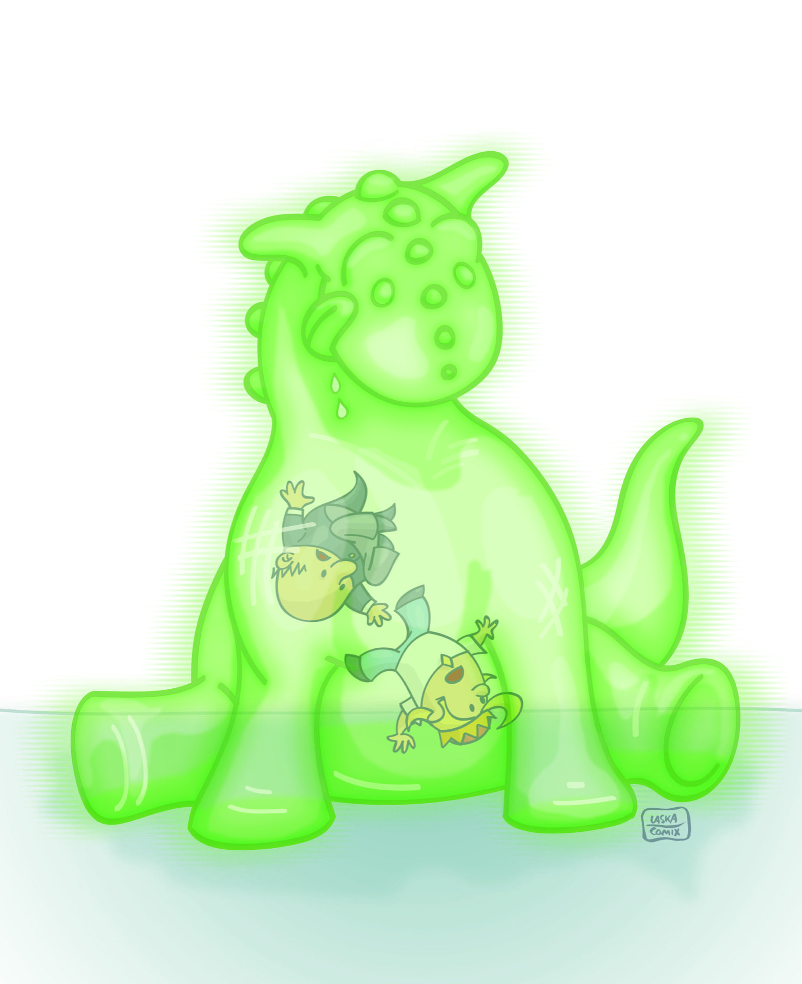 „Was soll das, Mensch?!“ brüllte der Drache, doch der Schatzmeister ließ sich nicht abhalten. Jede Armbewegung schaukelte den Drachen schneller und heftiger auf, wie ein Schiff im Orkan. Schließlich wackelte er so heftig, dass er mit einem laut schmatzenden glubsch zusammensackte. Nichts blieb von ihm zurück außer einer kleinen, wackeligen Pfütze.