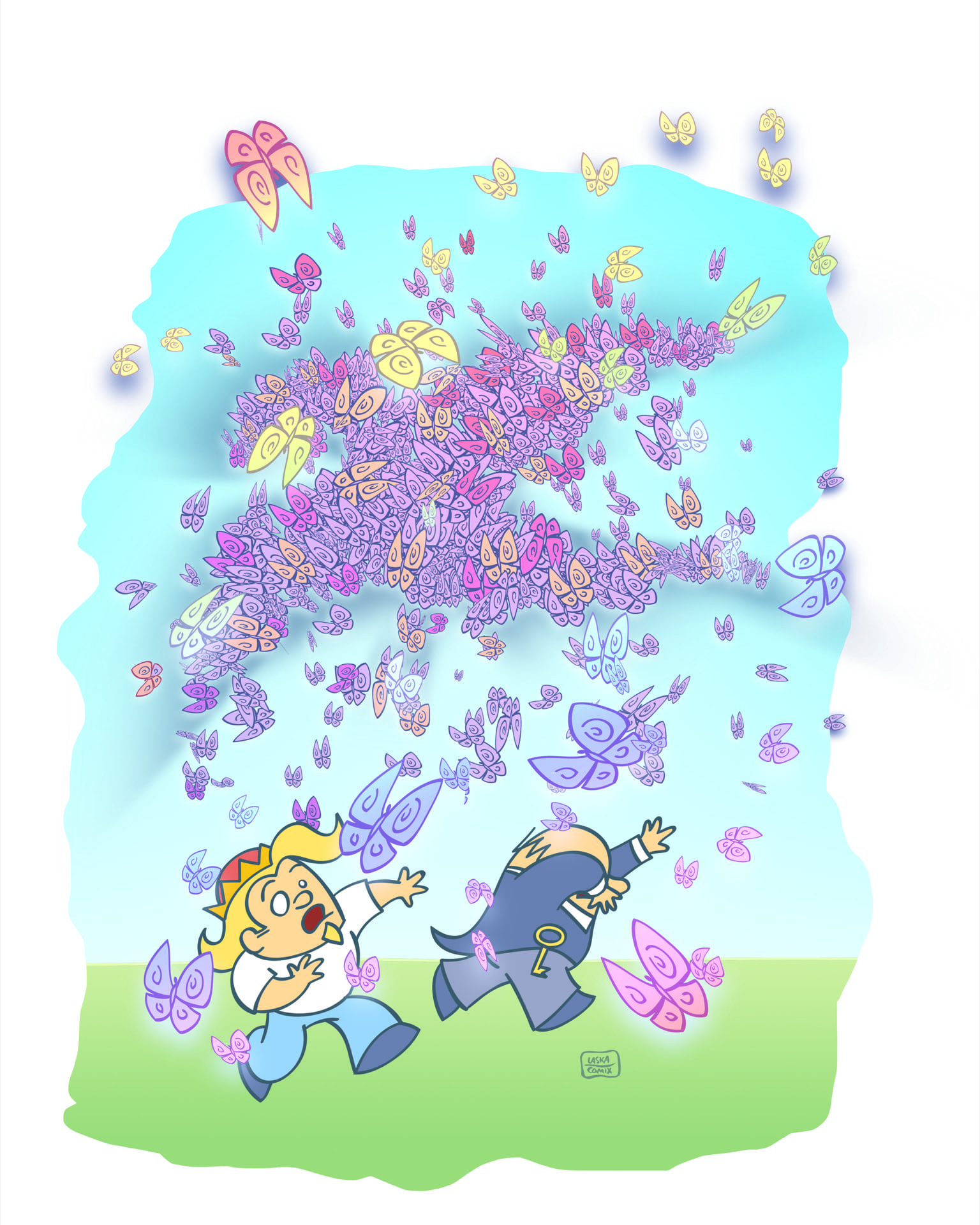 „Majestät! Ich finde keine … weil …“ - „Ich … mir … auch … nicht!“ Sie stolperten umher, abgelenkt und irritiert vom riesigen Schmetterlingsschwarm. Dann, mit einem leisen Gurgeln, nahm die Wolke die Form eines Drachen an. „Cha…“ - „…os!“ schrien beide, und verstummten.