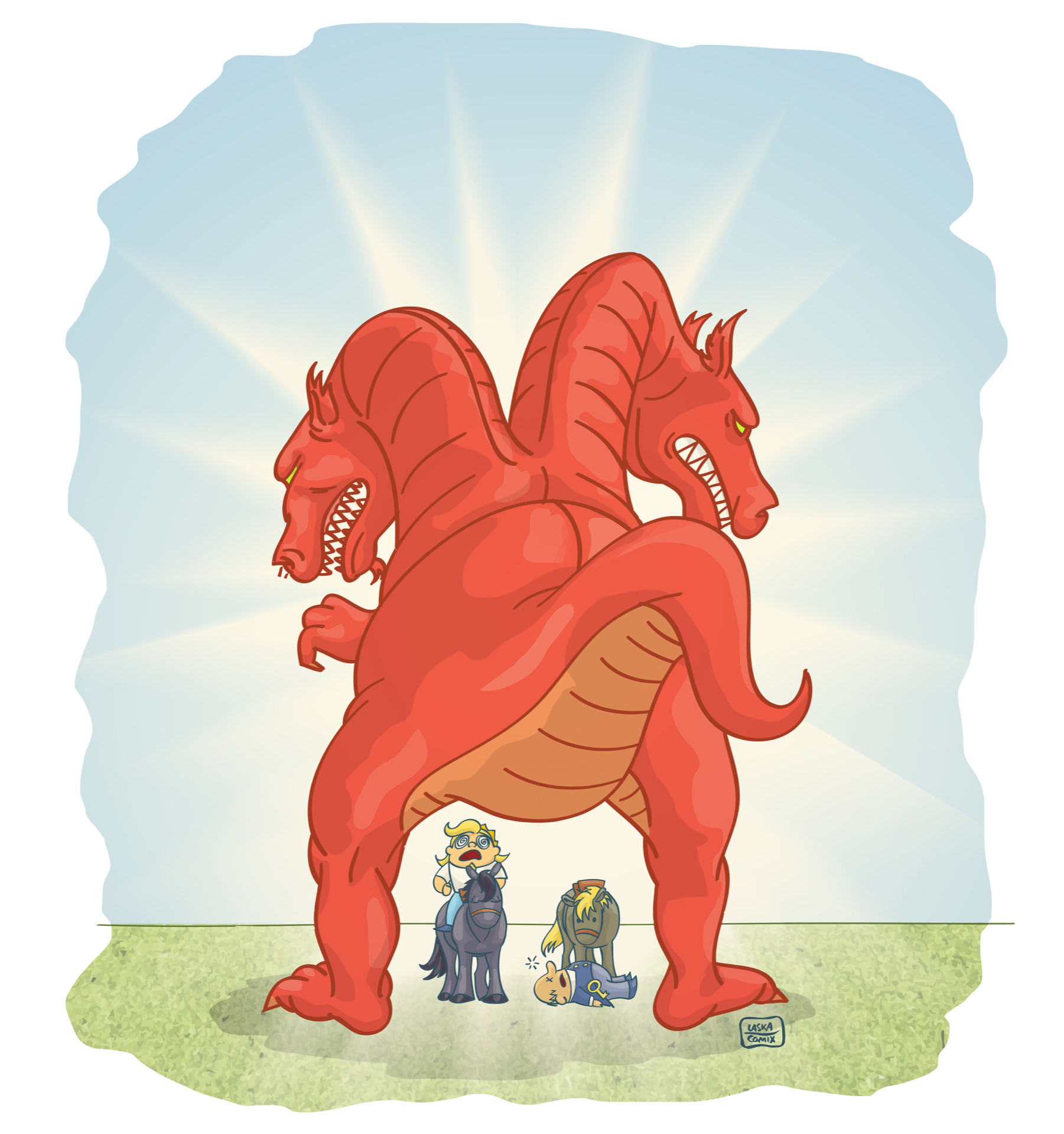 „Majestät? Sagten Sie gerade Gno…“ sagte der Schatzmeister noch, und verstummte vor Schreck: Vor ihnen war ein Drache erschienen; er schwang seine beiden Köpfe auf Armlänge vor ihre Gesichter und starrte sie an. Sternhagel und sein Schatzmeister starrten zurück.